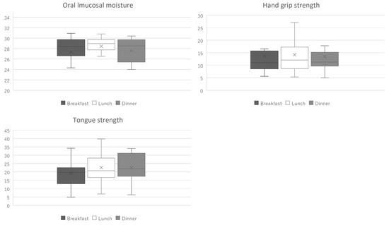 The median (interquartile range (IQR)) values of TS were 19.6 (6.1), 20.7 (3.2), and 21.9 (3.6) kPa in the morning, noon, and evening, respectively. Further, the median (IQR) values of HGS were 11.0 (0.5), 12.1 (3.0), and 11.3 (1.5) Kg in the morning, noon, and evening, respectively. The values for oral mucosal moisture were 28.4 (1.1), 29.0 (0.7), and 28.5 (3.0) in the morning, noon, and evening, respectively (Figure 2).