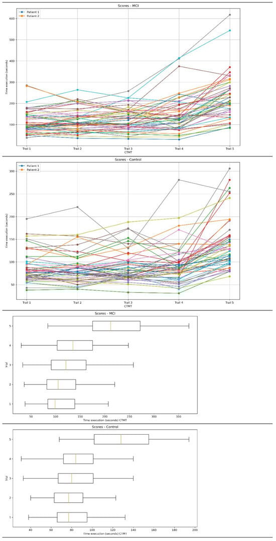 Relating the obtained results to the diagnostic problems occurring in daily clinical practices and also to the prevalence of MCIs in the older population, for the CTMT (overall score), the PPV and NPV scores were at an acceptable level, suggesting that the test could identify well both cases of cognitive impairments and the lack of deficits. The results for Trails 1–5 are mixed; however, for the most part, the PPV and NPV values are at an acceptable level, meaning that individual trails can effectively identify cases of cognitive impairments, like the condition where the measured cognitive functions remain normal. The CTMT may be useful in this aspect for key diagnostic points in the neurodegenerative process (normal cognitive functions vs. mild cognitive impairments; mild cognitive impairments with a risk of conversion to mild dementia) [,]. The analysis of the CTMT results in the control group showed that the greatest variability in the results, with significant outliers, occurred in Trails 4 and 5. In the control group, Trails 1, 2, and 3 appeared to be more balanced, but still contained outliers that were significant observations (Figure 2). It was observed that for a small number of patients in the control group, the CTMT performance remained similar to that of patients in the MCI group, which may suggest a deficit in executive functions that was not identified in the first screening (MoCA and MMSE).