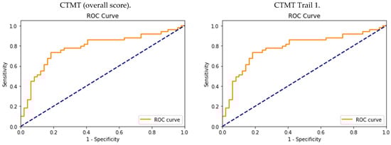 Increasingly, in indicators of the early stages of dementia, but also in cognitive impairments co-occurring in neuropsychiatric disorders, such as schizophrenia and bipolar affective disorder, the slowing down of one’s information processing speed is singled out as a dominant aspect across the spectrum of diverse cognitive dysfunctions [,]. Increasingly, in neuropsychology, cognitive functions are divided into “domain-specific” components with distinct functions and abilities (e.g., verbal and visuospatial) and “general domain” resources, such as processing speed. Neuropsychological studies of hierarchical cognitive organization indicate that the deficits observed in domain-specific tasks (e.g., impaired verbal memory) may be secondary to the general domain []. In a patient with an MCI, as indicated by the results we obtained using the CTMT, the problems in the working memory and difficulty of initiating an effective task performance may be due to the inability to implement a more automatic mode of information processing through the use of readily available associations and the rapid generation of stimulus-response relationships in the initial stages of the cognitive process []. Patients with MCIs during the CTMT had difficulties adequately processing the purpose of the task and inhibiting their automatic responses (e.g., performance involving connecting numbers to consecutive numbers instead of alternating letters). For this reason, Trail 1—“subjectively” the easiest—received the lowest AUC values. In the performance of more complex trails, patients with MCIs had to activate more controlled, effortful processing during the first stages of the task, slowly gaining proficiency in making associations between the stimulus and response (as especially observed in the CTMT Trail 5 results). It is likely that the connections of the prefrontal cortex with posterior areas and subcortical structures guarantee proper control, allowing the monitoring of intentional activities (an aspect of executive functions) []. The analyses conducted showed statistically significant correlations of the CTMT with the screening tests (MoCA) and the tests used in the neuropsychological assessment (verbal fluency test). All of the aforementioned tests were more focused on assessing the executive functions, such as working memory, which could be useful in the diagnosis of MCI [,,].