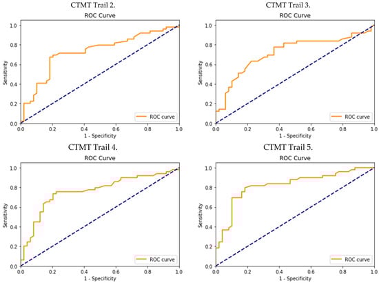 The positive predictive value (PPV) and negative predictive value (NPV) helped determine how many cases of cognitive impairments the test correctly identified (PPV) and how many healthy individuals it correctly identified (NPV). The CTMT overall score achieved a PPV of 0.79; the NPV was 0.75. Trail 1 had a moderate PPV, which was 0.66; the NPV was 0.71. Compared to Trail 1, Trail 2 achieved a higher PPV of 0.77; the NPV was 0.71. For Trail 3, the PPV was 0.73; the NPV was 0.67. Trail 4 showed a PPV of 0.77 and the NPV was 0. 74. Trail 5 had a very high PPV of 0.80; the NPV was 0.79. The PPV and NPV results varied between the trails, which may indicate the varying ability of each trail to classify the scored correctly. Trail 5 seemed to show the greatest ability to classify the scores correctly, with very high PPVs and NPVs. The results obtained are presented in Table 3.