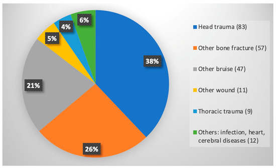 Regarding the cause of the accident, for 402 patients (40.6%), this was not specified either because the patient did not communicate the cause or because they were not able to. Without taking into account those 402 patients for which the cause was not specified, most of injuries were domestic (323; 54.8%), followed by traffic accidents (127; 21.6%). Only five patients (0.8%) had their accident during work, and the remaining 134 were classified as “other”, which includes self-harm lesions, bites, and assaults.