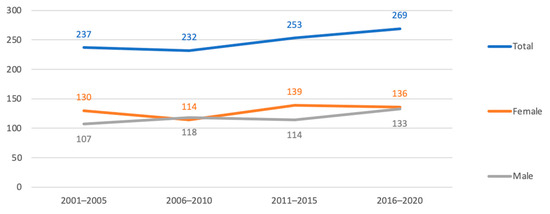 The results are first presented generally over the 20 years analyzed for epidemiological purposes, with ages reported as means, ranges, and standard deviations (SD), and other data are presented as a percentage. Secondly, the results are subdivided into five-year periods (2001–2005, 2006–2010, 2011–2015, 2016–2020) to analyze any eventual variation in time. The significance of the evolution of bounded categories (triage severity code, surgery, and hospitalization) was assessed by comparing their distribution using a two-sided chi-square test—using Microsoft Excel (2019)—with a confidence level of 95% and a significance level α = 0.05.