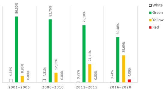 Evolution over time of severity of lesions (by triage code color) in percentages. White (not urgent, should be assessed within 240 min), green (minor urgency, should be assessed within 120 min), yellow (urgency, should be assessed within 30 min), and red (emergency, should be assessed immediately).