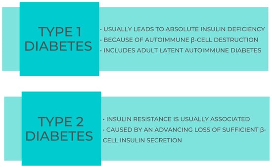 Type 1 diabetes mellitus (T1DM) is characterized by the death of β-cells, resulting in a definitive decrease in insulin output. Type II diabetes mellitus (T2DM), commonly referred to as non-insulin-dependent diabetes mellitus, is the prevailing form of diabetes mellitus. It arises due to a gradual impairment in the production of insulin and/or resistance to the physiological actions of insulin, as shown in Figure 1.