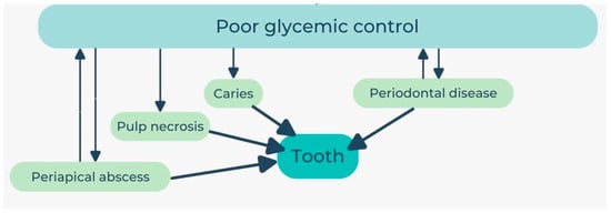 Oral issues are one of many problems that have been linked to both type 1 and type 2 diabetes and high blood sugar. These issues generally emerge when the levels of blood glucose are not regulated. So, patients with uncontrolled DM experience a higher number of teeth affected at the coronal and pulp levels [75]. On the other hand, there is a twofold impact effect on dental health caused by hyperglycemia. First, an increase in the amounts of glucose in the saliva and gingival crevicular fluid facilitates the development of harmful microorganisms [76].