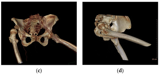 (a) Initial pelvic radiograph in which posterosuperior hip subluxation is observed without fractures; (b) Computerized Tomography (CT) scan (transverse). There is no presence of avascular necrosis of the right hip. (c,d) 3D reconstruction from the CT scan.