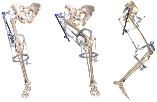 The hip assembly consisted of two half rings: the proximal attached to the pelvis above the acetabulum and the distal attached to the femoral shaft (Figure 4). This arrangement allowed relative movement of the two articular ends. To control the assembly, the rings were connected through a system of hinges and distractors allowing progressive joint diastasis and extension. A similar system was applied to the knee, but with two full rings attached to the femur and proximal third of the tibia. These were connected by two hinges aligned with the knee flexion axis and a rear motor to apply the extension force. A bone fixation was performed with hydroxyapatite-coated screws and reinforced with femoral and tibial metaphyseal wires.