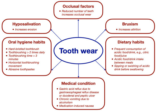 Knowledge of risk factors helps oral health care professionals detect older adults who are at risk of tooth wear, allowing them to implement preventive measures at an early stage. Several risk factors have been associated with tooth wear. Figure 1 illustrates these risk factors.