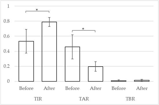 Change in CGM indicators. The vertical axis indicates the proportion of each indicator. * p < 0.05.