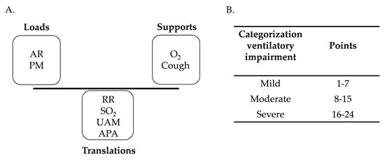 (A). classification of loads, translations, and supports. (B). categorization of total VWKI score. RR: respiratory rate; O2: additional oxygen contribution; SO2: oxygen saturation; UAM: use of accessory muscles; PM: pulmonary murmur; AR: airway resistance; APA: attempts to permeabilize the airway.