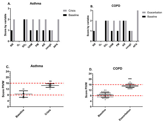 Comparison of median scores in asthma and COPD. (A) VWKI score by its variables in asthma comparing the baseline and crisis. (B) VWKI score by its variables in COPD comparing the baseline and exacerbation. (C) Total VWKI score in asthma comparing the baseline and crisis. (D) Total VWKI score by its variables in COPD comparing the baseline and exacerbation. In (C,D), the red line represents the change in the categorization of the ventilatory pattern. RR: respiratory rate; O2: additional oxygen; SO2: oxygen saturation; UAM: use of accessory muscles; PM: pulmonary murmur; AR: airway resistance; APA: attempts to permeabilize the airway. **: p < 0.01; ***: p < 0.001.