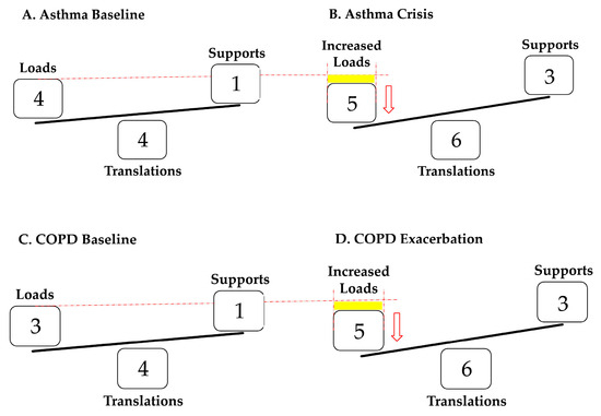 (A,B) shows the behavior of patients with asthma at baseline and in crisis; an increase in the loads in the crisis is observed, shown by the yellow rectangle, which causes a negative imbalance that represents the reduction in PM since AR is maintained. (C,D) shows the behavior of patients with COPD at baseline and in exacerbation, also showing an increase in loads in exacerbation. However, the difference is that, in such cases, they correspond to the joint increase in AR and PM. Both translations and supports are increased without distinction between the two pathologies.