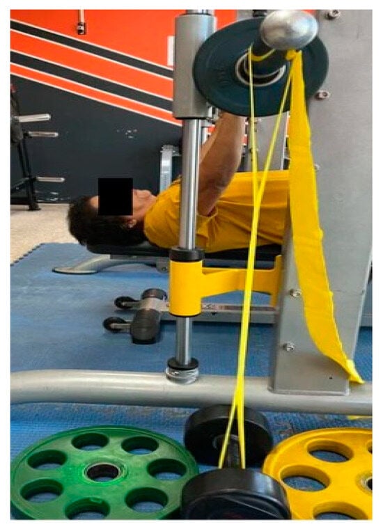 To standardize and regulate the intensity of the exercise across both conditions (BA and barbell with elastic bands), resistance was calculated based on the methodology outlined in a prior investigation by Wallace et al. []. This involved the following: (a) establishing the desired resistance value from the elastic bands (10% or 20% of the participants’ 65% 1 RM), and (b) deducting half of this value from the resistance provided by the barbell. The elastic bands were configured to apply the designated resistance value (10% or 20% of the participants’ 65% 1 RM) at the full contraction or the top phase of the BP exercise, when participants’ elbows were in close proximity rather than fully extended, while maintaining rigid wrists aligned directly over the elbows. Furthermore, the elastic bands began to exert tension when the barbell was in the bottom position of the lowering phase of the barbell BP when the bar was lowered until it touched the lower chest at approximately nipple level, with the upper arm abducted to approximately 45° at the shoulder joint. Additional forces of 10% and 20% from the elastic bands were chosen because these proportions fell within the range of values used in previous studies, representing a practical load exerted by elastic tension [,,] and improved brachial FMD in untrained men [].