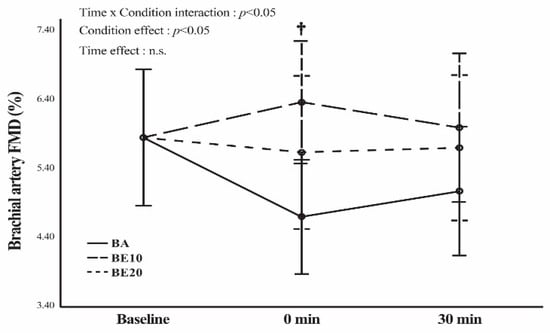 Brachial artery %flow-mediated dilation (FMD) in barbell alone (BA), barbell combining elastic bands at 10% of the participants’ 65% 1 RM (BE 10), and barbell combining elastic bands at 20% of the participants’ 65% 1 RM (BE 20). Data are expressed as means and 95% confidence interval error bars. A two-way (time × group) repeated measures analysis of variance (ANOVA) was performed. † p < 0.05 for the difference between BE10 and BA. n.s. = not significant (p > 0.05).