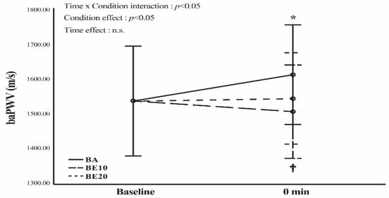 Brachial-ankle pulse wave velocity (baPWV) in barbell alone (BA), barbell combining elastic bands at 10% of the participants’ 65% 1 RM (BE10), and barbell combining elastic bands at 20% of the participants’ 65% 1 RM (BE20) conditions. Data are expressed as means and 95% confidence interval error bars. A two-way (time × group) repeated measures analysis of variance (ANOVA) was performed. * p < 0.05 for the difference from the baseline value in BA. † p < 0.05 for the difference between BA and BE10. n.s. = not significant (p > 0.05).