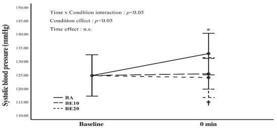 Systolic blood pressure before and after resistance exercise in barbell alone (BA), barbell combining elastic bands at 10% of the participants’ 65% 1 RM (BE10), and barbell combining elastic bands at 20% of the participants’ 65% 1 RM (BE20) conditions. Data are expressed as means and 95% confidence interval error bars. A two-way (time × condition) repeated measures analysis of variance (ANOVA) was performed. * p < 0.05 for the difference from the baseline value in BA. † p < 0.05 for the difference between BA and BE20. n.s. = not significant (p > 0.05).