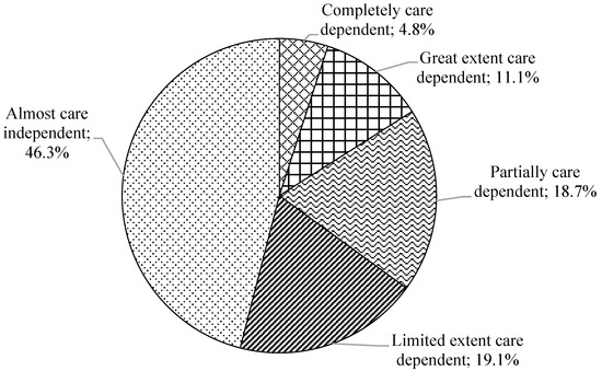 Figure 1 illustrates the distribution of the care dependency levels across all the participants according to the Care Dependency Scale (CDS). In total, 4.8% and 11.1% of the PLWD reported being completely care-dependent and care-dependent to a great extent, respectively. The percentage of the participants who were partially and, to a great extent, care-dependent was similar (approximately 19%). Nearly half of the participants (46.3%) were completely care-independent. The total CDS score was 61.3 (SD = 16.7), in which the lower the score, the more dependent on care a patient was. The mean score of 15 components ranged from 3 to 5. The average score of each component of the CDS in the participants with moderate and severe dementia was significantly lower than those with mild dementia (Table S2).