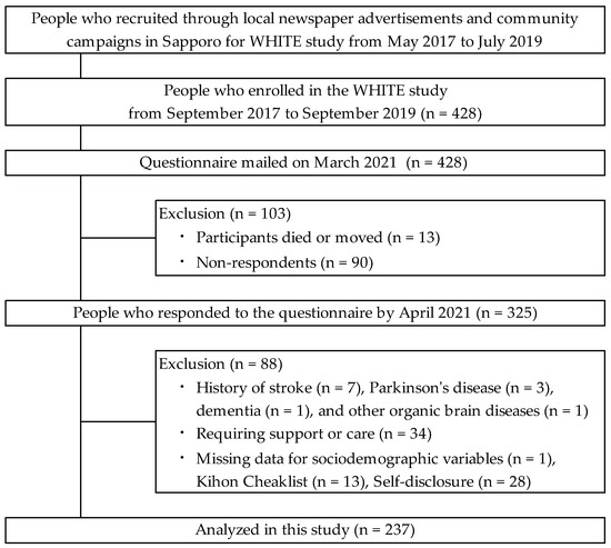 Figure 1 shows a flowchart of the study participants. The participants were recruited through local newspaper advertisements and community campaigns in Sapporo, Japan for the Widely Hokkaido Individual Training for Elderly (WHITE) study, which conducted a community-based health check survey from May 2017 to July 2019. A total of 428 participants enrolled in the WHITE study from September 2017 to September 2019; a mailed questionnaire survey was conducted in March 2021. Of those mailed, 13 were confirmed to have died or moved, and 90 non-respondents were excluded from the study. There were 325 participants who responded to the present questionnaire by April 2021 (response rate 75.9%). The percentage of women enrolled was 65.4%. The inclusion criteria for participation were individuals aged ≥65 years and those who attended the WHITE study in Sapporo. The exclusion criteria were a history of stroke (n = 7), Parkinson’s disease (n = 3), dementia (n = 1), and other neurological disorders (n = 1), and the need for support or care certified by the Japanese public long-term care insurance system (n = 34). Participants who provided insufficient sociodemographic data (n = 1), or incomplete answers on the Kihon Checklist (KCL; n = 13) [25], or self-disclosure (n = 28) were excluded. The process, from participant recruitment to data collection and management, was conducted by researchers licensed as occupational or physical therapists affiliated with WHITE. The study was approved by the Sapporo Medical University Ethical Review Board (approval number 28-2-7). Written informed consent was obtained from each participant after the procedure was explained.