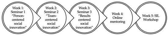 The Senior Innovation Lab (SIL) training initiative emerged as a result of the above considerations, aiming to address the social need to highlight the social relevance of older adults in society, no longer as something pejorative but as an opportunity for social and economic growth. The SIL initiative seeks to favor the acquisition of innovation knowledge and tools to develop new solutions to different challenges and opportunities of older adults’ population, as well as to identify the importance and the need for social innovation for them. Its goals were as follows: (1) to promote knowledge and awareness in students and professors about the opportunities and challenges posed by the culture of innovation and social entrepreneurship, defined as a process that involves the innovative use and combination of resources to seek opportunities for stimulating social change and addressing social needs [28]; (2) to encourage the acquisition and development of entrepreneurial skills of the participants in the context of innovation; and (3) to facilitate an alliance between HEIs and participating organizations in the gerontology sector to promote knowledge transfer and enhance research and innovation capacities.