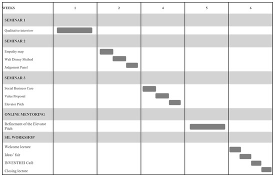 The SIL initiative adopted EntreComp, a comprehensive, flexible, multipurpose framework designed to support and inspire action to improve entrepreneurship [33]. This framework consists of three areas of competence that each include five competences: (1) Ideas and Opportunities: spotting opportunities, creativity, vision, valuing ideas, ethical and sustainable thinking; (2) Resources: self-awareness and self-efficacy, motivation and perseverance, mobilizing resources, financial and economic education, and mobilizing others; (3) Into Action: take the initiative; planning and management; coping with uncertainty, ambiguity and risk; working with others and learning through experience.