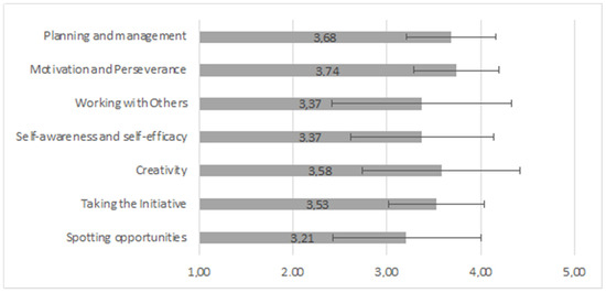 The participants considered the competences important/very important for innovation. The most outstanding was “Motivation and Perseverance” and the least outstanding was “Spotting opportunities”. There was only a slight variability (SD 0.45) in responses, indicating that “Motivation and Perseverance” was the most important competence for the participants. However, in the case of the least important (“Spotting opportunities”), there was greater variability (SD 0.79), indicating differences in its perceived importance in the social innovation field.