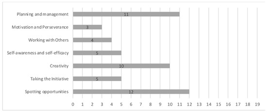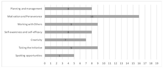The proportions of responses to the second question are shown in Figure 4. Most of the participants who responded to the survey perceived themselves as having the competence of “Motivation and perseverance”. In addition, about 50% of the participants perceived themselves as having the ability to collaborate and work with others as a group (“Working with others”), as well as to have the courage to take the lead (“Taking the Initiative”). Moreover, 42% of the participants perceived themselves to have skills in defining goals and action plans (“Planning and management”), and identifying their strengths and weaknesses (“Self-awareness and self-efficacy”). On the other hand, only 26% of the participants perceived that they had the ability to detect opportunities for innovation (“Spotting opportunities”).
