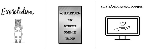 Logos of the three solutions developed through the Senior Innovation Lab training initiative: Exosolution—use of an ergonomic exoskeleton structure to maintain social life by enhancing strength and mobility; Silver Plus—digital platform designed for recently retired older adults who seek to socialize, in order to prevent situations of unwanted loneliness; Coidandome Scanner—digital platform designed to facilitate searches for services that offer person-centered care.