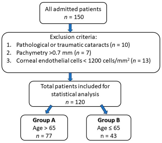 The inclusion criteria of the study group consisted of patients who underwent cataract surgery by phacoemulsification technique, performed by the same surgeon (in order to minimize bias), while the exclusion criteria were patients with pathological or traumatic cataracts, pachymetry greater than 0.70 mm and an endothelial cell count less than 1200 cells/mm2. The study design is presented in Figure 2.