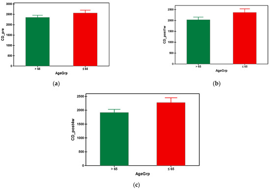 Graphical comparison means of (a) CD_pre, (b) CD_post1w and (c) CD_post4w parameters, with confidence intervals as error-bars, calculated for AgeGrp factor levels.