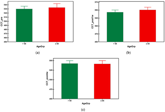 Graphical comparison means of (a) CCT_pre, (b) CCT_post1w and (c) CCT_post4w parameters, with confidence intervals as error-bars, calculated for AgeGrp factor levels.