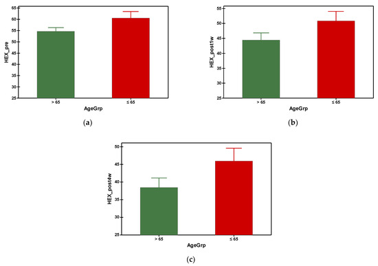 Graphical comparison means of (a) HEX_pre, (b) HEX_post1w and (c) HEX_post4w parameters, with confidence intervals as error-bars, calculated for AgeGrp factor levels.