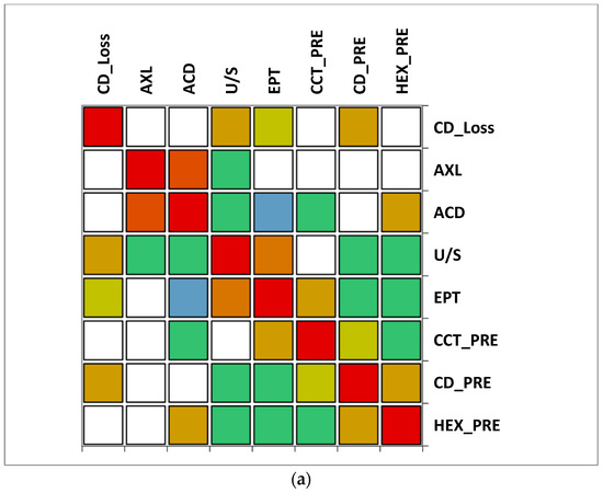 The correlation matrix between different variables reveals that in group A (>65 y), there was a moderate correlation between CD loss and U/S and also a moderate correlation between U/S and EPT. A moderate negative correlation was observed between ACD and EPT. In group B (≤65), a moderate positive correlation was observed between CD loss, AXL and U/S, while a very strong correlation between EPT and U/S was noticed. Additionally, a moderate negative correlation was observed between CD and U/S. In both groups, a very strong positive correlation between AXL and ACD was observed (Figure 7).