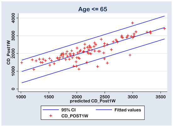 The quality of the prediction (i.e., the predicted CD_post1w values) was tested with linear regression between the CD_post1w values and the predicted ones (predicted CD_post1w). There linear regressions were analyzed without constant calculation. However, the predicted values resulted in statistically significant values (p < 0.0001) of 1.019773 for the Group A (Age > 65) and 0.9709181 for the Group B (Age ≤ 65), both very close to unity value; thus, the correlation between the calculated and predicted CD_post1w values are positive and strong (Table 8 and Table 9). These results also had an adjusted accuracy of 97.97% for the group A and 97.89% for the group B, both higher than the 95% proposed accuracy (Table 8 and Table 9).