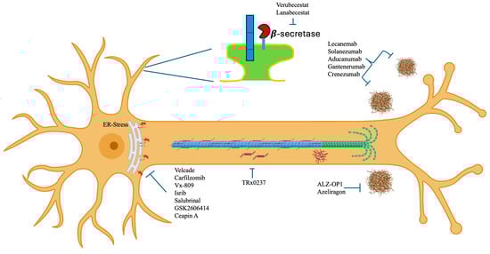 Phase III drugs and molecules being tested for the treatment of Alzheimer’s disease applied at different sites in the neuronal cytoplasm.