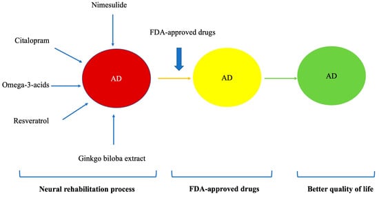 The questions are, how could we treat a disease whose origin is multigenic, and what model would be suitable for a study? We know that one pill will not be able to cure AD. Among the five FDA-approved drugs, donepezil, galantamine, rivastigmine, tacrine, and memantine, unfortunately none of them work, as patients at first seem to recover cognitive ability, but then that ability is lost over time [].