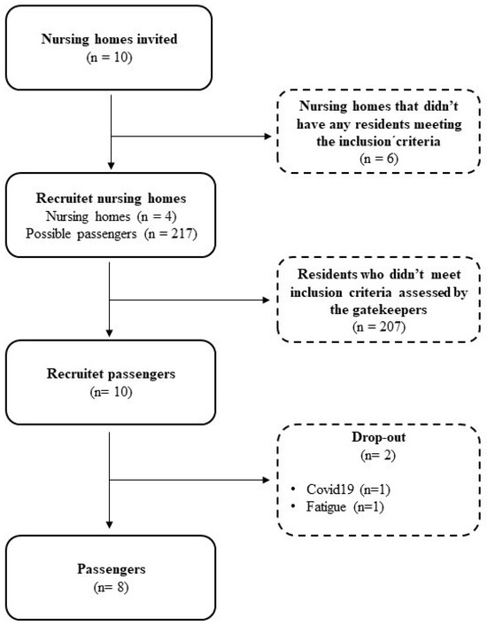 Ten nursing homes were contacted, but we were only able to include passengers from four nursing homes. Given the abovementioned criteria and constraints, we invited ten passengers, of whom eight accepted the invitation to participate (Figure 1). This reflects the significant health challenges faced by many elderly individuals in nursing homes. We obtained informed written consent from all the participants. Pseudonyms for the passengers are used throughout the paper.