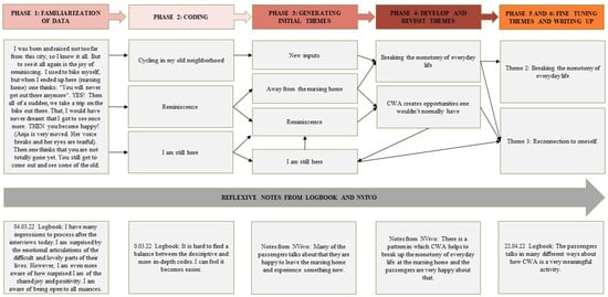 We actively participated in two one-hour-long rides as passengers during observations beginning 15 min prior to and after the ride. Our approach focused on allowing passengers and pilots to initiate conversations. The third observation occurred at the nursing home and involved three informal passenger interviews. Detailed field and reflexive notes were promptly recorded or dictated following each observation, following the methodology outlined by Green and Thorogood [] (Supplementary Materials S2). The aims were to understand the passengers’ roles, familiarize ourselves with the context, and gain insights into the CWA participation experience.