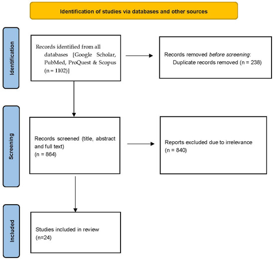 A total of 1102 papers were initially identified in the databases. After removing duplicates, 864 articles underwent screening based on the PRISMA screening approach. At the conclusion of the screening process, a total of 24 peer-reviewed papers met all the inclusion criteria for this review (see Figure 1).