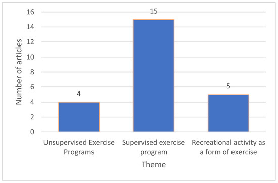 Five publications used various recreational activities as a form of exercise, to improve the mental health and well-being of dementia patients [18,21,24,29,35]. Studies were conducted in Australia and included an exploratory study [18], a longitudinal study [21], two prospective observational studies [24,29], and one systematic review [35]. Participant numbers varied from 421 participants to 10 participants. The studies used various types of recreational activities including art gallery outings, gardening, laughter yoga, and swimming. These studies showed that physical activity significantly decreases depression and agitation symptoms, improves mood, and the overall well-being of patients with dementia.