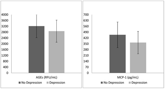 Mean advanced glycation end products (AGEs) and monocyte chemoattractant protein 1 (MCP-1) levels in the two groups identified by the presence of depressive disorders.