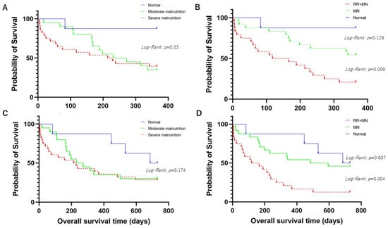 (A) shows comparison of overall survival time (OS) among aspiration pneumonia patients with mild malnutrition, moderate malnutrition, or normal nutrition status for 1-year prognosis. (B) shows comparison of OS among aspiration pneumonia patients with higher respiratory rate (RR) (≥22) and malnutrition (MN), MN, or normal nutrition status for 1-year prognosis. (C) shows comparison of OS among aspiration pneumonia patients with mild malnutrition, moderate malnutrition, or normal nutrition status for 2-year prognosis. (D) shows comparison of OS among aspiration pneumonia patients with higher RR (≥22) and MN, MN, or normal nutrition status for 2-year prognosis.
