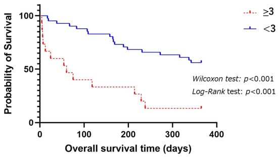 Figure 2 shows comparison of OSs between a modified R-GLIM score ≥ 3 and <3 among the patients as follows. The patients with a modified R-GLIM score ≥ 3 had significantly shorter OSs than those with a modified R-GLIM score < 3 (p < 0.001 by Log-Rank test).