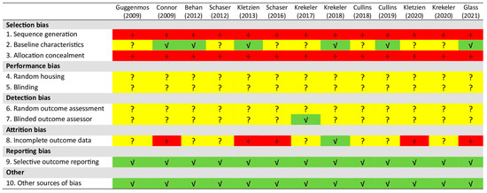 - Hooijmans, C.R.; Rovers, M.M.; de Vries, R.B.; Leenaars, M.; Ritskes-Hoitinga, M.; Langendam, M.W. SYRCLE’s risk of bias tool for animal studies. BMC Med. Res. Methodol. 2014, 14, 43. [Google Scholar] [CrossRef]