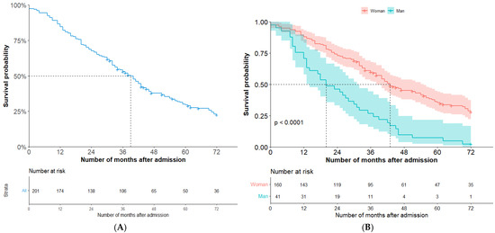 Of the 201 individuals included in the analysis sample, a total of 147 residents died during the study. Follow-up occurred between 2000 and 2018, with the first and last admissions to nursing homes taking place on 16/02/2000 and 09/07/2015, respectively, resulting in a maximum follow-up period of nearly 17 years. For individuals included in the analysis, median survival was 39 months with a 95% confidence interval (CI) of 33 to 43 months, and the survival curve is shown in Figure 2A. As shown in Figure 2B, female residents spent longer in nursing homes, with a significant difference in median survival time compared to males. The median time from admission to death was 43 months for females (95% CI 38–55, n = 160) and 20 months for males (95% CI 14–31, n = 41). Survival was slightly shorter for those admitted at an older age, i.e., those aged 65 to 86 years (n = 118), compared to those over 85 years (n = 83), with median survival times of 42 months and 36 months, respectively, though the difference was not significant (p = 0.06).
