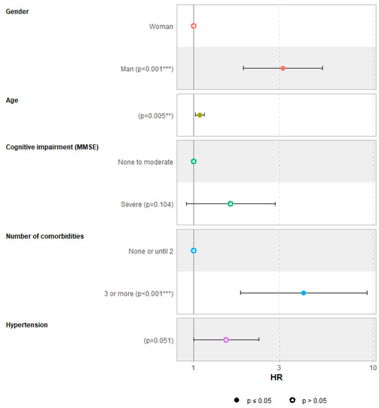 The analysis was conducted on 118 individuals, excluding 83 participants who had missing data for at least one of the selected variables. The model estimates the coefficients of the explanatory variables and their effect on the risk of death. The results are expressed as instantaneous hazard ratios (HRs) with 95% confidence intervals and are presented in Figure 3 (see Supplementary Materials for the results table).