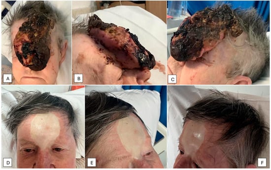 Preoperative and post operative images of the 120 × 80 × 30 mm Melanoma (A–C). Post-operative skin graft (D–F), taken 2 years after the procedure.