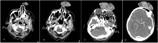 (A–D) Select Computerised Tomography slices showing the position and extent of the melanoma. There was no evidence of erosion into the frontal bone.