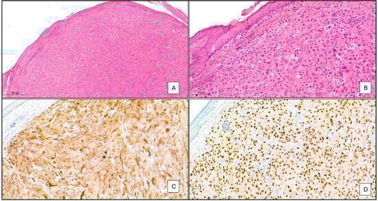 The melanoma was excised down to the pericranium with a 2 mm radial margin and 0.1 mm deep margin. A full thickness skin graft from her right iliac fossa was applied to her forehead. Subsequent histological examination of the tumour revealed a 120 × 80 × 30 mm exophytic tumour confirmed as an ulcerated nodular melanoma with a Breslow thickness of at least 30 mm, vertical invasion and pathological staging of pT4b N0 M0. Mitotic count was 4/mm2. Importantly, there was no lymphovascular or perineural invasion. Histology revealed atypical epithelioid cells with pleomorphic nuclei, prominent nucleoli, and occasional intranuclear inclusions (Figure 3A,B). The tumour did not arise from an underlying dysplastic naevus. Immunohistochemistry showed positive expression of melanocytic markers (Melan A, SOX10 (Figure 3C,D) as well as S100 and HMB45) but negative for CD 10, MNF 116, CK5/6, P63, SMA, Desmin, and Caldesmon. There were focal in situ components consisting of single atypical melanocytic cells along the dermoepidermal junction. Mutation analysis revealed the presence of wild type BRAF gene whilst BRAF Val600Glu (BRAF V600E) and Val600Lys (BRAF V600K) activation variants were not detected.