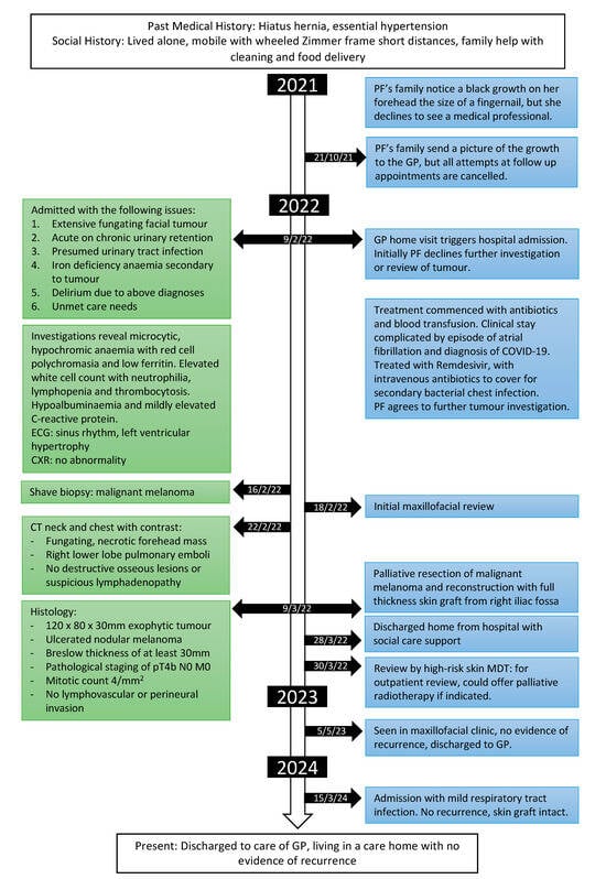 Our patient was reviewed by the high-risk skin multidisciplinary team (MDT) 30/3/22 and the case was overseen by the maxillofacial team who arranged follow up and considered offering palliative radiotherapy. However, one year post excision, she was asymptomatic and therefore no further treatment or investigation was recommended. She was subsequently discharged to the care of her GP with the following medications: Apixaban 5 mg twice a day, Bisoprolol 2.5 mg once a day, Amlodipine 5 mg once a day, and Lansoprazole 30 mg once a day. She was admitted for a minor respiratory tract infection in March 2024, two years after the excision. She had no evidence of tumour recurrence, and the skin graft was intact (Figure 1D–F). The timeline illustrating our patient’s admission to follow up is shown in Figure 4.