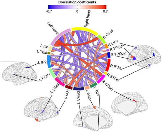 The correlation between hand dexterity and brain measures in the brain structures selected by elastic net.